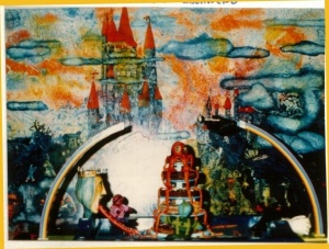 Anyway, there was also a friend of mine, Alex Rabus, a great painter, who made a huge painting called "Gentle Giant" and we shifted the painting downstairs close to the dressing room, where we also laid out a formidable catered feast for the two bands, Gentle Giant and openers Banco. Then there was Alex's wife, Renate, who made this big five-story cake (it was excellent) and they decorated it with the motives of all the GG records recorded so far (up to "Interview").