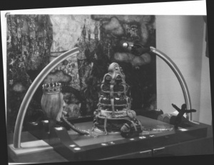In the photos, you can quite clearly recognize all of the motives. My girlfriend did the rainbow from "Interview" in wood, upon which was fixed the "Free Hand". Another pair of tied-up hands, in white, was placed on the right side. Underneath, there was a Chianti bottle covered with marzipan (the king from "Power and the Glory"), from which a marzipan tongue was sticking out ("Acquiring the Taste"). On top of the cake was that great "Octopus", also in marzipan. Only "In a Glass House" was less obvious. You can see a few scattered pieces of glass in the black and white shot.