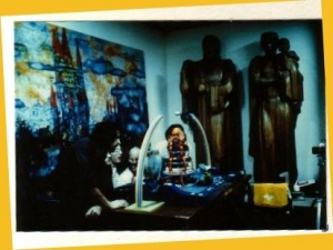 The painting in the background is that "Gentle Giant" painting/fresco of Alex Rabus (he worked about 2 years on that one!) It was really funny to see the musicians staring at that cake. None of them dared to cut the cake because it was too beautiful, but Derek (or Ray) threw himself onto the three little knitted friends, knitted with loving detail, with "Three Friends" motives on the back, and pocketed them as souvenirs. Only later did Banco swallow the cake almost in one gulp!