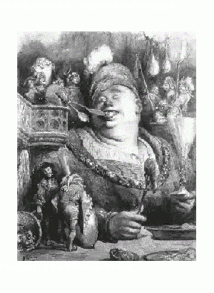 Pantagruel's Nativity is based on the second and third chapters, "Of the Nativity of the Most Redoubted Pantagruel" and "Of the Mourning Gargantua Made for His Wife Badabec." These two chapters begin with the birth of Pantagruel, who was "so amazingly large and so heavy that he could not come into the world without suffocating his mother." The former chapter explains why "the earth was dry and burning" at the time of Pantagruel's birth--and what effect this would have on the young giant's character! The latter has Gargantua saying "Shall I weep...Yes. Why then?"--quoted almost verbatim in the GG song. He remains torn between grief for the loss of his wife and joy at the birth of his son.